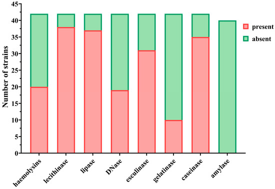 Expression of soluble virulence factors in S. aureus strains. Pore-forming toxins (haemolysins, lecithinase, lipase) were frequently expressed, indicating strong potential for tissue invasion. Among exotoxins, esculinase and caseinase were most prevalent, suggesting roles in iron acquisition and extracellular matrix degradation. Gelatinase and DNase were less commonly detected, while amylase was absent in all strains.