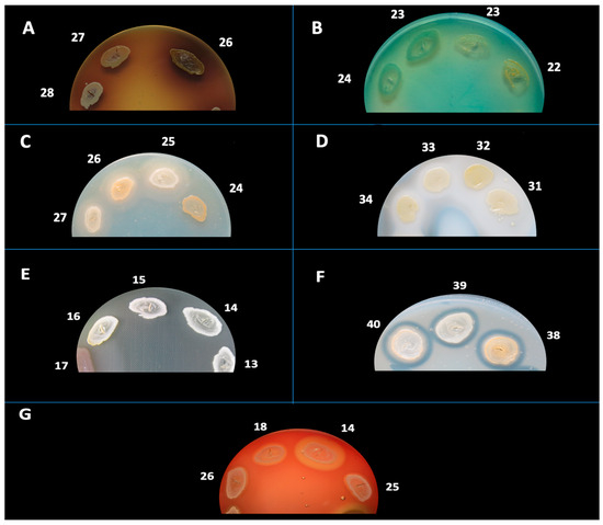 Phenotypic detection of soluble virulence factors produced by S. aureus isolates. Representative images of enzymatic activity are shown for: (A) esculinase (esculin hydrolysis on bile-esculin agar), (B) DNase (DNA hydrolysis with methyl green), (C) lipase (lipid degradation on spirit blue agar), (D) caseinase (casein hydrolysis), (E) gelatinase (gelatin liquefaction), (F) lecithinase (lecithin degradation on egg-yolk agar), and (G) hemolysins (hemolysis on blood agar). White numeric labels indicate the strain identifiers corresponding to individual S. aureus isolates. Numbers refer to strain IDs. Petri dish diameter = 90 mm. Scale bar = 10 mm.