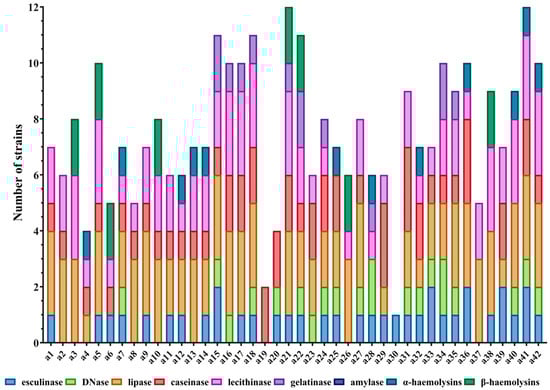 Distribution of soluble virulence factors in S. aureus strains. The stacked bar chart displays the number and variety of enzymatic virulence factors expressed by each of the 42 S. aureus isolates. Most strains produced multiple enzymes, including combinations of exotoxins (e.g., DNase, esculinase, gelatinase, caseinase, amylase) and pore-forming toxins (e.g., lecithinase, lipase, α- and β-haemolysins). Strains such as a15, a18, a21, a22, a36 and a41 demonstrated the highest cumulative enzymatic activity, reflecting a potentially greater pathogenic capacity.