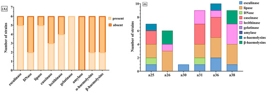 Soluble virulence factor profiles in S. aureus strains isolated from paronychia; (A) overall presence or absence of nine enzymatic virulence factors among six selected strains; (B) stacked bar representation of individual virulence profiles for strains a25, a26, a30, a31, a36, and a38. Most strains exhibited multiple enzymatic activities, with a36 and a38 expressing the broadest range of virulence factors. These profiles reflect a heightened pathogenic potential among S. aureus isolates from paronychia.