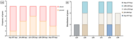 PCR-based genotypic profiling revealed that 38 out of the 42 S. aureus strains carried at least one of eight virulence-associated genes, either encoding extracellular toxins or cell wall-associated proteins, including hlg (γ-hemolysin), lpv (Panton–Valentine leukocidin), fib (fibrinogen-binding protein), clfA and clfB (clumping factors A and B), bbp (bone sialoprotein-binding protein), fnbB (fibronectin-binding protein B), and ebps (elastin-binding protein).