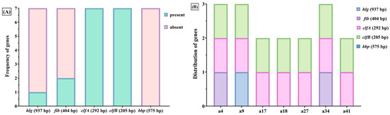 (A) Presence or absence of five adhesion genes (hlg, fib, clfA, clfB, bbp) in strains isolated from acneiform lesions. The y-axis represents the number of strains in which each gene was detected (present) or not detected (absent). (B) Stacked representation showing gene distribution in selected acneiform isolates (a4, a9, a17, a18, a27, a34, a41). Each colored segment corresponds to a detected gene, with a maximum of five genes per strain. The y-axis indicates the number of adhesion-related genes expressed per strain. All strains expressed clfA and clfB, while bbp was entirely absent. This uniform profile contrasts with the more heterogeneous gene patterns observed in strains from paronychia.