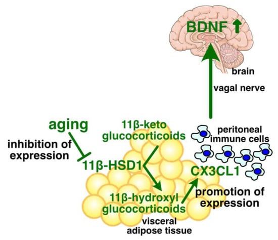 Both the protein level and enzymatic activity of 11β-HSD1 were reported to be lower in visceral adipose tissue of aged mice compared to young mice [,]. Visceral adipose tissue-specific knockdown of 11β-HSD1 expression decreased both the adipose CX3CL1 expression and the hippocampus BDNF levels in young mice []. Thus, the age-associated decline in CX3CL1 expression in visceral adipose tissue appears to be caused by the reduced expression of 11β-HSD1 in the tissue. This may suggest that glucocorticoids are involved in the regulation of the adipose CX3CL1 expression, considering that 11β-HSD1 regulates glucocorticoid availability in visceral adipose tissue [,]. An in vitro study indicated that naturally occurring glucocorticoids, such as corticosterone and hydrocortisone, increased CX3CL1 expression in a concentration-dependent manner []. Therefore, circulating glucocorticoids may contribute to maintaining the hippocampus BDNF levels through the induction of CX3CL1 expression in visceral adipose tissue in young mice, but not in aged mice (Figure 1).