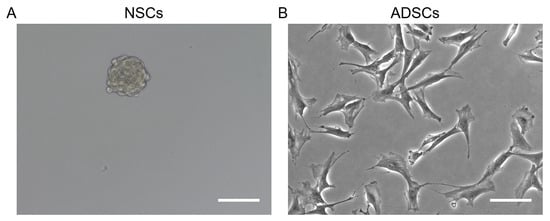 Morphological characteristics of NSCs (A) and ADSCs (B) from adult rats (scale bar: 50 µm).