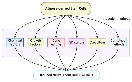 ADSCs have emerged as a promising source for iNSCs generation owing to their accessibility, multipotency, and lower immunogenicity [,]. Various induction methods were established for differentiation of ADSCs into iNSCs with specific advantages and limitations associated with each []. The most widely used induction strategies are described herein, such as chemical factors, growth factors, gene editing, 3D culture, co-culture, and combination approaches (Figure 2 and Table 2).