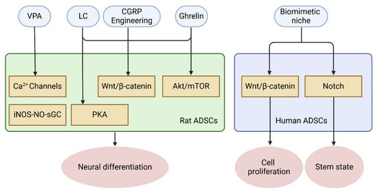 Valproic acid (VPA): VPA, an inhibitor of histone deacetylase, induces mature neuronal differentiation of ADSCs through the regulation of calcium signaling and nitric oxide pathways [,]. Furthermore, VPA improves the efficiency and specificity of induction by synergistically interacting with other chemical inducers [].