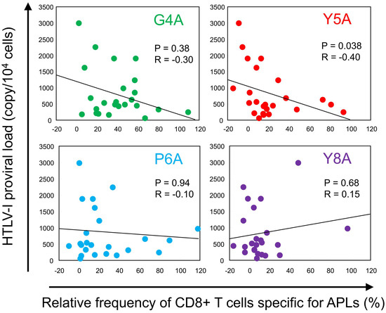 To explore the relationship between TCR degeneracy and viral burden, we plotted HTLV-1 PVL against the relative frequency of CD8+ T-cell responses to each APL (Figure 2). For all APLs except Y8A, we observed negative correlations between PVL and the magnitude of CTL responses to the APLs. The inverse correlation was statistically significant for the Y5A-specific response (p = 0.038, R = −0.40). To evaluate cumulative responsiveness, we calculated the mean relative recognition across all APLs and assessed its association with PVL. However, no significant correlation was detected (p = 0.27). Additionally, the overall frequency of Tax 11–19-specific CTLs did not correlate with PVL (p = 0.38).