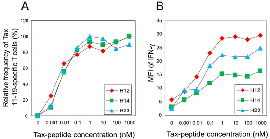 To evaluate functional T-cell avidity, we selected three HAM patients (H12, H14, and H23) who exhibited distinct levels of CTL frequency and TCR degeneracy (Table 1) [16]. These patients demonstrated substantial inter-individual variation in both the frequency of Tax 11–19-specific CTLs (19.5%, 3.3%, and 5.5%, respectively) and the TCR degeneracy (38.0%, 8.9%, and 73.7%, respectively). Tax 11–19-specific CTL responses were measured at various peptide concentrations and normalized to the maximal IFN-γ response for each individual. The peptide concentration required to elicit 50% of the maximal IFN-γ response (EC50) was calculated and used as an index of functional avidity.