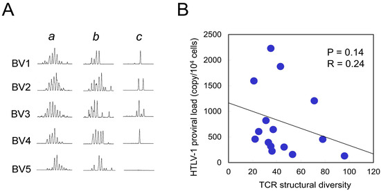 Correlation between TCR structural diversity and PVL. (A) Representative TCR BV CDR3 spectratyping results are shown for five TCR BV families (BV1–BV5). Lane a: 1 × 105 PBMCs from a healthy control, displaying a Gaussian distribution indicative of polyclonal TCR repertoires. Lane b: 1 × 104 PBMCs from the same healthy control, showing partial loss of peak distribution due to reduced input. Lane c: 1 × 104 purified Tax 11–19-specific CTLs from a HAM patient, exhibiting an oligoclonal pattern with reduced peak diversity. Due to the limited availability of HTLV-1 Tax 11–19-specific CTLs, a cell input of 1 × 104 was used for subsequent analyses. TCR structural diversity was quantified by summing the number of distinct CDR3 length peaks across all 26 TCR BV families. The mean total peak count in Tax 11–19-specific CTLs from 15 HAM patients was 44.1 ± 21.7 (mean ± SD), compared to 106 peaks in control PBMCs (lane b), indicating reduced TCR diversity in the patient group. (B) TCR structural diversity, measured by the total number of CDR3 length peaks, is plotted against HTLV-1 PVL, revealing a negative correlation that did not reach statistical significance (p = 0.14).