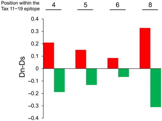 Dn-Ds values at amino acid positions 4, 5, 6, and 8 within the HTLV-1 Tax 11–19 epitope are shown for each group in Figure 5, with red and green bars representing the high- and low-degeneracy groups, respectively. Dn-Ds values were consistently greater than zero across all examined residues in the high-degeneracy group, whereas values in the low-degeneracy group were consistently below zero, indicating stronger CTL-mediated selective pressure in the former.