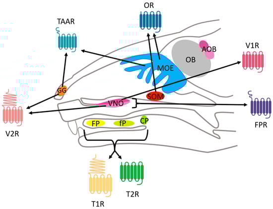 A schematic representation of mouse chemosensory systems. Accessory olfactory bulb (AOB), circumvallate papillae (CP), foliate papillae (fP), formyl peptide receptor (FPR), fungiform papillae (FP), Grueneberg ganglion (GG), main olfactory epithelium (MOE), olfactory bulb (OB), olfactory receptor (OR), septal organ of Masera (SOM), taste receptor type 1 (T1R), taste receptor type 2 (T2R), trace amine-associated receptor (TAAR), vomeronasal organ (VNO), vomeronasal type 1 receptor (V1R), and vomeronasal type 2 receptor (V2R).