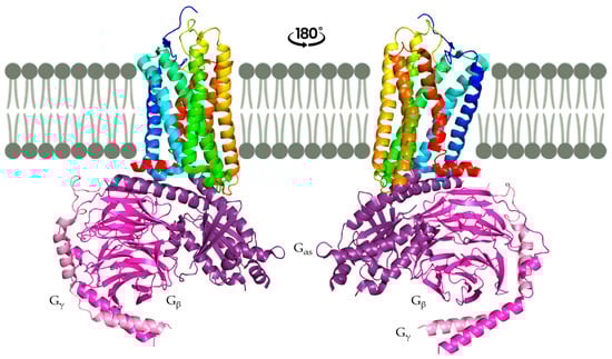 The structure of human OR51E2, a class A GPCR, coupled to the G-protein miniGs399 (PDB ID: 8F76); the structure was released in 2023. The helical bundle conformation specific to GPCRs is visible in the membrane region of the protein. OR: rainbow color; Gαs: purple; Gβ: pink; Gγ: light pink. Visualization with Maestro v14.2.121 (Schrodinger, LLC., Portland, OR, USA).