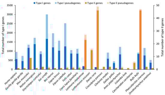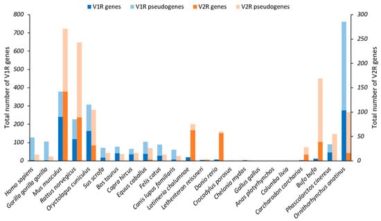 A bar chart with the number of genes and pseudogenes of VR families in different vertebrates. The dataset was extracted from Policarpo et al. [], and the raw data are available in Supplementary Materials Excel File S1.