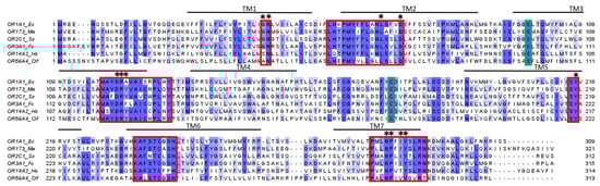 The alignment of different ORs from different species, highlighting conserved motifs. Residue conservation greater than 30% is marked in blue, and intensity is proportional to conservation. Red boxes highlight conserved motifs of ORs. The asterisks (*) indicate conserved residues in all class A GPCRs. Green boxes show conserved cysteines involved in the disulfide bridge. Ec: Equus caballus; Mm: Mus musculus; Ss: Sus scrofa; Fc: Felis catus; Hs: Homo sapiens; Clf: Canis lupus familiaris. Alignment was performed with MAFFT and viewed with Jalview v2.11.4.1.