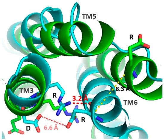 Moreover, an ionic bridge between TM3 and TM6 is also involved in OR activation; it is closed when the receptor is inactive, but when it is in an active conformation, the interaction is disrupted, leading to the displacement of TM6. The residues involved appear to be the arginine of the DRY motif of the TM3 helix, with a residue at the beginning of TM6 forming a hydrogen bond (Figure 6). If the TM6 residue is positively charged and sufficiently large (arginine or lysine), a double ionic bridge will form with the addition of a hydrogen bond between the TM6 residue and the aspartic acid of the DRY motif [].