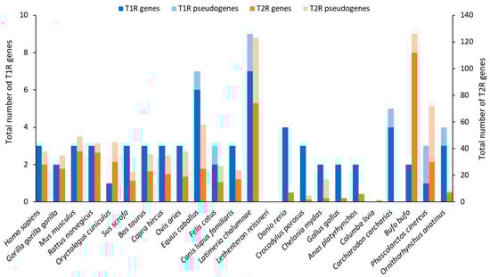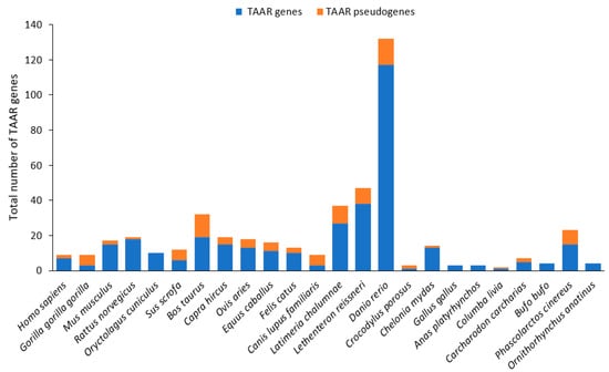 A bar chart with the number of genes and pseudogenes of TAARs in different vertebrates. The dataset was extracted from Policarpo et al. [], and the raw data are available in Supplementary Materials Excel File S1.