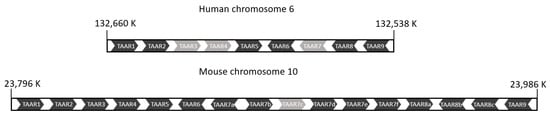The nine families of gnathostome TAARs originated from the TAAR1 gene undergoing eight duplication events, which occurred before the origin of amniotes for TAAR2 to TAAR5 and before the origin of mammals for the others [,]. Three distinct subfamilies can be identified in phylogenetic and functional analyses (TAARs 1–4, TAAR 5, and TAARs 6–9). The orientation of the open reading frames is also significant; human TAARs 1–5 and TAARs 6–9 display inverse orientations, and the same arrangement is found in rodents, except for a block composed of some paralogs of TAAR7 and TAAR8 with the same orientation as the TAAR 1–5 group (Figure 8). The ligands of TAARs are also different; the TAAR 1–4 group is activated by primary amines, and the TAAR 5–9 group by tertiary amines. This classification into two groups is the one preserved today []. New putative TAAR families specific to eutherians (E1) and metatherians (M1-M3) have recently been found, and they belong to the TAAR 5–9 group [].