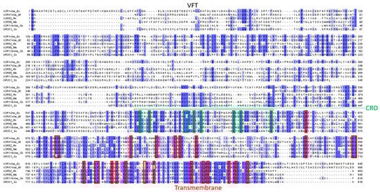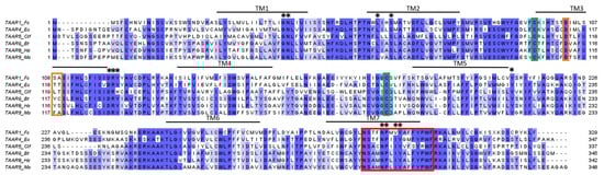 The alignment of different TAARs from different species, highlighting conserved motifs. A residue conservation greater than 30% is marked in blue, and intensity is proportional to conservation. The asterisks (*) indicate conserved residues in all class A GPCRs. Green boxes show conserved cysteines involved in the disulfide bridge. The red box highlights the conserved motif of TAARs. Orange boxes indicate residues specifically involved in the binding site of TAARs. Fc: Felis catus; Ec: Equus caballus; Clf: Canis lupus familiaris; Bt: Bos taurus; Hs: Homo sapiens; Mm: Mus musculus. Alignment was performed with MAFFT and viewed with Jalview v2.11.4.1.