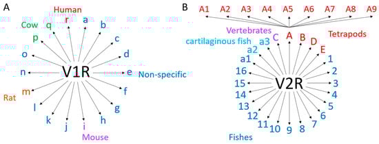 VR families and subfamilies of different species. (A) V1R classification with species-specific subfamilies. Some VRs are not yet well classified; thus, the species specificity could be updated in the future. (B) V2R classification in vertebrates.