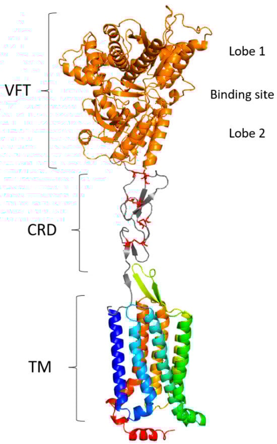The GPCR family is a large family of around 1000 genes in humans []. It is the largest group of eukaryotic membrane receptors, which respond to a wide range of external signals, and is highly diverse. These receptors can activate heterotrimeric G-proteins (guanine nucleotide-binding proteins) in the cell. Human G-proteins are divided into four major families according to their G-alpha (Gα) subunit (Gs, Gi/o, Gq/11, and G12/13), each with a different signaling cascade, but all involving the catalysis of the guanosine diphosphate (GDP)/guanosine triphosphate (GTP) exchange, leading to subunit dissociation. Mammalian GPCRs can be classified into five families according to their sequence homology and pharmacological features with the ABC classification []. The class A rhodopsin-like GPCRs are the biggest family, divided into aminergic, peptide, protein, lipid, melatonin, nucleotide, steroid, dicarboxylic acid, sensory, and orphan subgroups. The class B secretin receptor like family is composed of the secretin (B1) and adhesion (B2) subfamilies. Class C is composed of metabotropic glutamate receptors (mGluRs), γ-aminobutyric acid B (GABAB) receptors, Ca2+-sensing receptors (CaSRs), taste receptor 1 (T1R), vomeronasal type 2 receptor (V2R), olfactory receptor C in fish, and several orphan receptors []. Class C proteins are characterized by their complex structure with multi-domain and dimeric assembly. The class F, or frizzled/smoothened-like, family is composed of frizzled receptors (FZDs) and the smoothened receptor (SMO). Also, class T (or T2 for taste 2) is a recent family that shows structural similarity to class A GPCRs but with low sequence identity (<20%) with previously known types of GPCRs, leading to the creation of this new class of T GPCRs [,]. Another classification can be used based on phylogenetic relationships, namely, the GRAFS system, composed of the five families: glutamate, rhodopsin, adhesion, frizzled/taste 2, and secretin receptor families [].