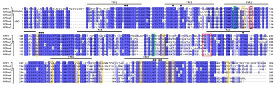 TAARs share the same structural characteristics as ORs, as both are class A GPCRs with the 7TM structure, with the N-terminal part exposed to the outside of the cell and a length of around 350 amino acids. TAAR protein sequences share residue conservation specific to class A GPCRs (Figure 9), such as the conserved cysteines in TM3 and ECL2 involved in the disulfide bridge or the D(E)RY motif of the ionic lock involved in the activation of the receptor [,]. These conservations suggest that they share the same mechanism of activation described in the OR section. However, TAAR sequences show a specific conserved motif in TM7: NSxxNPxxY(H)xxxY(F)xWF [].