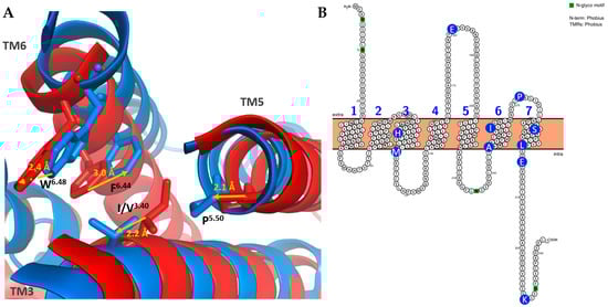 Thanks to mutagenesis and in silico studies, some residues have been identified as part of the binding site. This binding site involves the upper parts of TM3, TM5, TM6, and, to a lesser extent, TM7. ECL2 also seems important for the binding site []. Indeed, ECL2 is implicated in ligand selection and permits the formation of a hydrophobic pocket for the ligand [].