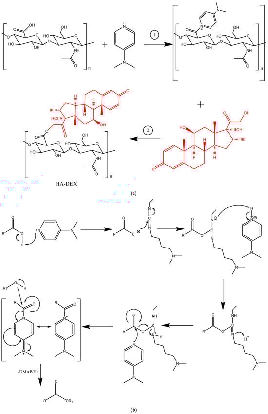 The synthesis scheme for HA-DEX (a) and the mechanism of esterification according to Steglich (b).