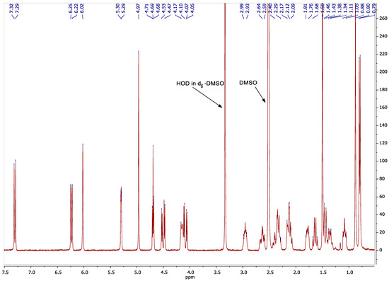 1H NMR (400 MHz, dimethyl sulfoxide -d6) spectrum of DEX, δ 7.31 (d, 1H), 6.25-6.22 (dd, 1H), 6.02 (s, 1H), 5.30-5.29 (dd, 1H), 4.97 (s, 1H), 4.71-4.68 (t, 1H), 4.53-4.48 (dd, 1H), 4.17-4.10 (m, 1H), 4.06 (d, 1H), 2.99-2.93 (m, 1H), 2.64-2.59 (m, 1H), 2.52-2.51 (t, 1H), 2.4-2.30 (m, 1H), 2.17-2.12 (m, 1H), 2.09 (d, 1H), 1.81-1.76 (m, 1H), 1.68-1.59 (m, 1H), 1.50 (s, 3H), 1.46-1.44 (m, 1H), 1.35-1.38 (dd, 1H), 1.11-1.05 (m, 1H), 0.88 (s, 3H), and 0.80 (d, 3H).