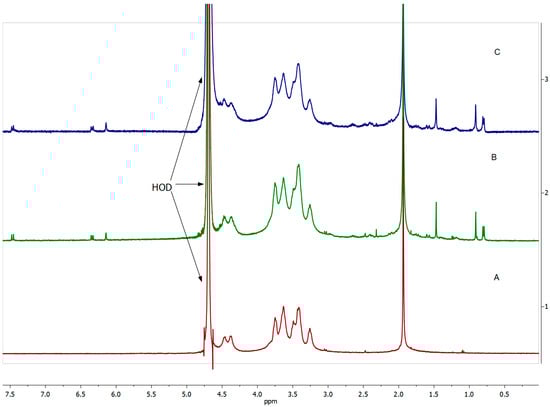 1H NMR spectra (400 MHz, D2O) of (A) HA, (B) HA-DEX-5, and (C) HA-DEX-10.