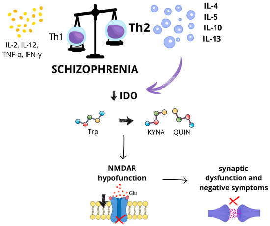 Specifically, Th1-type cytokines, such as IFN-γ, are crucial for initiating pro-inflammatory responses, while Th2-type cytokines—including interleukins IL-4, IL-5, IL-10, and IL-13—serve as regulatory factors that counteract inflammation and maintain immune homeostasis [28,29]. Several researchers have proposed that schizophrenia is associated with an immune imbalance skewed towards a Th2-dominant profile [30,31,32]. This immune shift is characterized by decreased levels of Th1-related cytokines, such as IL-2 and IL-12, alongside elevated levels of Th2-associated cytokines, including IL-4 and IL-10 [31,33]. Chiang et al. demonstrated significantly lower ratios of IFN-γ/IL-4, IFN-γ/IL-10, IL-2/IL-4, and TNF-α/IL-4 in patients with schizophrenia compared to healthy controls, suggesting that Th2 predominance may constitute a distinct immunological feature of schizophrenia [32]. Malashenkova et al. further showed that excessive Th2 cytokine production, particularly IL-4, can inhibit indoleamine 2,3-dioxygenase (IDO)—an enzyme crucial to tryptophan metabolism [33]. Disruption of this metabolic pathway may contribute to N-methyl-D-aspartate (NMDA) receptor hypofunction, which has been implicated in synaptic dysfunction and the development of negative symptoms in schizophrenia [33]. Other studies have also emphasized the link between impaired Th1 responses, reduced IDO activity, and the tryptophan–kynurenine pathway in schizophrenia pathophysiology [26] (Figure 1).