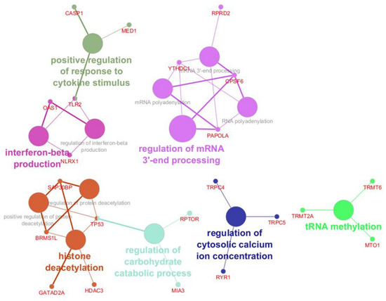 In terms of biological processes, the proteins were ranked by the regulation of mRNA 3’-end processing, regulation of cytosolic calcium ion concentration, tRNA methylation, histone deacetylation, interferon-beta production, and positive regulation of response to cytokine stimulus (Figure 3).