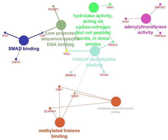 When using molecular function ontology, most of the proteins exhibit protein binding activity (methylated histone binding, histone deacetylase binding, core promoter binding, and SMAD binding), highlighting the critical key role of these proteins in immune tolerance and inflammation in PFAPA. At the same time, other proteins take part in hydrolase activity and adenylyltransferase activity.