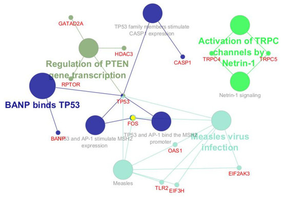 Analyzing the pathways revealed that the proteins were ranked by Regulation of PTEN gene transcription, activation of TRPC channels by Netrin-1, binding of BANP to TP53, and measles virus infection (Figure 5).