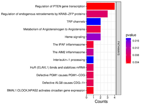 The Reactome tool for the pathway database indicates that these proteins are primarily involved in the regulation of PTEN gene transcription, the regulation of endogenous retroelements by KRAB-ZFP proteins, TRP channels, the metabolism of angiotensinogen to angiotensins, the IPAF and AIM2 inflammasomes, and Interleukin-1 processing (Figure 6 and Table 1).