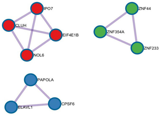 The hub genes analysis revealed three different clusters. The first cluster, which included green nodes, comprised three different genes from the zinc-finger protein family: ZNF354A, ZNF44, and ZNF233. The second cluster with red nodes included four different genes: IPO7, CLUH, EIF4E1B, and NOL6. The last cluster, which included blue nodes, consisted of PAPOLA, ELAVL1, and CPSF6 (Figure 7).
