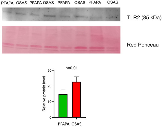 Western blotting of TLR2 from tonsillar B cells in PFAPA and OSAS. TLR2 is upregulated in B cells of patients with OSAS compared to patients with PFAPA (p = 0.01). The intensity of the immunostained bands was normalized to the total protein intensity, as measured from the same blot stained with Red Ponceau. The results are presented as a histogram, with each bar representing the mean ± standard deviation.