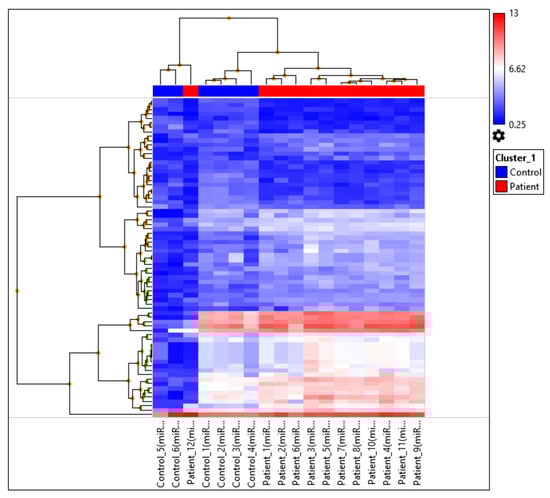 The hierarchical clustering and heatmap of miRNA expression profiles. Patient samples (red) and control samples (blue) are displayed. The clustering analysis revealed a clear separation between patients and controls, with Patient_12 clustering closer to the control group, suggesting individual variability within the patient cohort. Color intensity reflects relative expression levels, with red indicating higher expression and blue indicating lower expression.