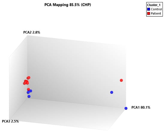 PCA mapping of microRNA expression profiles. Patient samples (red) and control samples (blue) are shown. Patient_12 was positioned closer to the control group, suggesting a molecular profile distinct from other patients. PCA1, PCA2, and PCA3 accounted for 85.5% of the total variance.