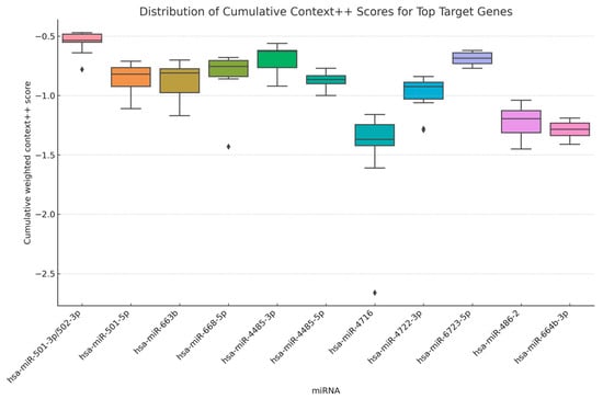 A boxplot was generated to visualize the distribution of these scores across all analyzed miRNAs (Figure 4). The plot revealed marked variation in score distribution among different miRNAs. For example, hsa-miR-486-2 and hsa-miR-664b-3p showed a relatively narrow interquartile range (IQR) and lower median scores, suggesting stronger and more consistent predicted interactions. In contrast, miRNAs such as hsa-miR-4716 and hsa-miR-663b exhibited broader score distributions, indicating a wider range of target interaction strengths.