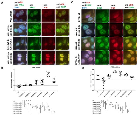 Analysis of VDR translocation and VDR-RXRA colocalization level after different 1,25(OH)2D3 time points treatment of squamous carcinoma cell line A431 WT, and primary culture keratinocytes HPEKp. (A) Images of A431 cells, non-treated and treated with 1,25(OH)2D3 at different time points, showing VDR fluorescence translocation and colocalization of VDR (anti-VDR; red) with RXRA protein (anti-RXRA; green) in nuclei (DAPI; blue). (B) Pearson’s correlation coefficient values for colocalization of VDR and RXRA in the nucleus of the A431 cells at different time points of 1,25(OH)2D3 treatment. (C) Images of HPEKp cells, non-treated and treated with 1,25(OH)2D3 at different time points, showing VDR fluorescence translocation and colocalization of VDR (anti-VDR; red) with RXRA protein (anti-RXRA; green) in nuclei (DAPI; blue). (D) Pearson’s correlation coefficient values for colocalization of VDR and RXRA in the nucleus of the HPEKp cells at different time points of 1,25(OH)2D3 treatment. To analyze colocalization in cell nuclei, they were marked with a white dashed line using a dedicated neural network (cellSense, Olympus, Tokyo, Japan). Statistically significant differences are denoted with asterisks: * p < 0.05, *** p < 0.005, **** p < 0.0001. Scale bar 5 μm.
