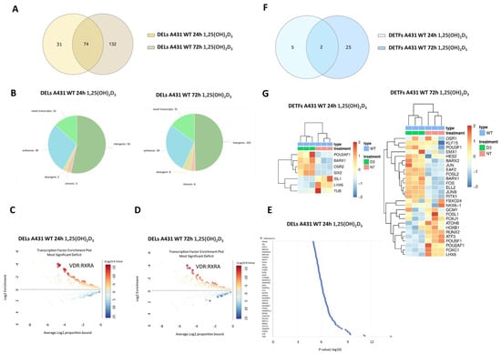 Time-dependent changes of differentially expressed lncRNAs (DELs) and differentially expressed transcription factors (DETFs) in a human squamous carcinoma cell line (A431) treated with 1,25(OH)2D3 for 24 h and 72 h. (A) Venn diagram showing the distribution of the DELs from A431 cells treated for 24 h or 72 h with 1,25(OH)2D3. (B) Classification of DELs from A431 cell line after 1,25(OH)2D3 treatment for 24 h and 72 h. (C,D) CiiiDER enrichment analysis showing the transcription factor binding sites (TFBSs) that are significantly over-represented (greater than zero) and under-represented (less than zero) for the DELs in A431 cell line after 1,25(OH)2D3 treatment for 24 h or 72 h compared with the background sequences. The plot shows the proportion of regions bound for each TF. The y-axis shows the enrichment (ratio of proportion bound), and the x-axis shows the average log proportion bound. The sizes and colors of the circles indicate the ±log10 (p-value). (E) LncSEA platform annotation analysis results show DEL-protein interactions in the A431 cell line after 1,25(OH)2D3 treatment for 24 h or 72 h. (F) Venn diagram showing the distribution of the DETFs in A431 WT cells treated for 24 h with 1,25(OH)2D3. (G) Heat map of RNA-seq expression data showing the DETFs in A431 WT cell line after 1,25(OH)2D3 treatment for 72 h.