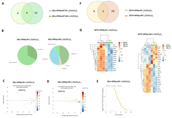 Analogous analyses were conducted for DETFs at the same time points of 1,25(OH)2D3 treatment and the same thresholds (log2FC > 1 or log2FC < −1, and FDR < 0.05). DETFs accounted for 9.23% of all DEGs compared to non-treated cells (log2FC > 1 or log2FC < −1, and FDR < 0.05). These DETFs were all upregulated in the upward direction. Extending the incubation time with 1,25(OH)2D3 to 24 h resulted in an over 3.5-fold increase in the total number of DEGs and, interestingly, a two-fold decrease in the proportion of DETFs (4.9%) (Figure 3F). Such prolonged incubation with 1,25(OH)2D3 also changes the proportion between DETFs, up and down deregulated, from upregulation at 4 h to balanced up and downregulation at the 24 h time point.