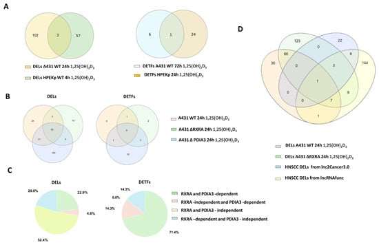 Comparative analysis of DELs from 1,25(OH)2D3-treated A431 cells to DELs from healthy cells, A431 cells lacking functional VDR, RXRA, and PDIA3 genes, and lncRNAs typical of head and neck squamous cell carcinoma (HNSC). (A) Venn diagrams showing the differences in DELs and DETs between healthy cells and cancerous cells treated with 1,25(OH)2D3. (B) Venn diagrams showing the distribution of the DELs and DETFs in A431 WT, A431 ΔRXRA, and A431 ΔPDIA3 cells treated for 24 h with 1,25(OH)2D3. (C) Percentage distribution of RXRA dependent/independent genes and/or PDIA3 after 24 h 1,25(OH)2D3 treatment. (D) Venn diagram showing the distribution of the DELs between DELs from HNSC databases lnc2Cancer3.0 and lncRNAfunc and DELs from A431 cells treated with 1,25(OH)2D3 for 24 h and 72 h.