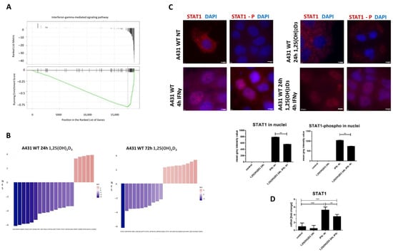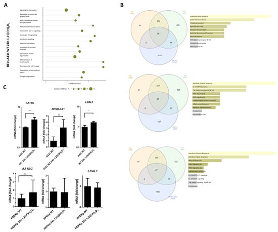The possible impact of lncRNAs on interferon-gamma signaling after 1,25(OH)2D3 treatment of squamous cell carcinoma line A431. (A) Reactome analysis of DELs in A431 cells treated with 1,25(OH)2D3 for 24 h. (B) The Venn diagrams show AATBC, NPSR1-AS, and LCAL1 target genes (downloaded from the lncRNAfunc tool) with all DEGs from A431 cells treated with 1,25(OH)2D3 for 24 h and 72 h, and the ontology of genes is common to the three defined groups mentioned above. (C) mRNA expression of AATBC, NPSR1-AS1, LCAL1 before and after treated with 1,25(OH)2D3 of A431 and HPEKp cells. Statistically significant differences are denoted with asterisks: ** p < 0.01, *** p < 0.005.