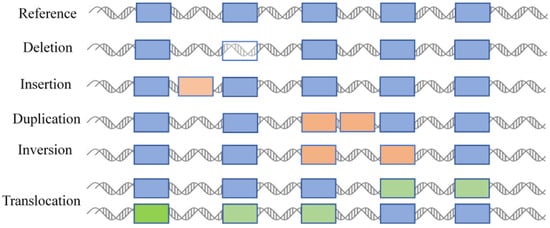 Structural variations are defined as alterations in the length, copy number, orientation, or chromosomal location of DNA segments among different individuals within the same species. Structural variations mainly encompass six basic types (deletions, insertions, duplications, copy number variations, inversions, and translocations) and involve DNA segments typically larger than 50 base pairs (Figure 1) []. Such changes have the potential to impact gene functions, expression levels, or regulatory elements, which may consequently result in phenotypic differences or diseases. Insertions involve the addition of nucleotides into a DNA sequence, while deletions involve the removal of nucleotides. Small insertions or deletions, which are typically less than 50 base pairs in length, occur within coding regions or promoters. They can cause frameshift mutations or the abnormal expression of genes []. In contrast, larger insertions or deletions—which may encompass entire genes or chromosomal segments—may have more profound impacts on genome structure and function []. Duplication involves the replication of specific DNA segments in the genome, leading to an increase in their copy numbers. They can be categorized into two types: tandem duplications and dispersed duplications. To some extent, copy number variation can be regarded as a type of duplication. It can cover a relatively large genomic region, ranging from changes involving a few genes to those encompassing multiple gene clusters or even chromosomal segments. It therefore has the potential to significantly impact the functions of multiple genes, which has been confirmed in plants [] and humans []. Inversion refers to a structural change in which a segment of DNA on a chromosome is reversed in orientation. Inversions can be classified into two types depending on whether the inverted region includes the centromere: pericentric inversions and paracentric inversions. Translocation refers to the movement of a chromosomal segment from one position to another. This movement can occur within the same chromosome (intra-chromosomal translocation) or between different chromosomes (inter-chromosomal translocation). Translocation may have significant impacts on gene function, chromosomal stability, and the phenotype of an organism.