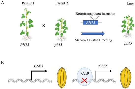 Application of structural variations for crop breeding. (A) in a molecular-marker-assisted breeding approach, Parent 1 carrying the wild-type PH13 allele was crossed with the parent harboring the retrotransposon insertion ph13 allele. Subsequently, a specific molecular marker was developed and employed to screen the genotypes of the breeding progeny with ph13 allele. (B) using a gene editing-based breeding approach, cultivars carrying the wild-type GSE5 were employed to edit the promoter of GSE5, which reduced the expression of GSE5 and resulted in wider and heavier seeds.