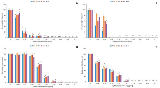 Among all tested organisms, the M. furfur strain, with a minimal inhibitory concentration (MIC) of 0.39 μg/mL for all tested AgNP types, was found to be the most sensitive (Table 1). In C. albicans, growth inhibition reached 85% or higher using all tested AgNP types at a concentration of 0.39 μg/mL. However, according to the obtained MIC values (Table 1), the 4 s AgNP type was the least active against the tested microorganism—total growth inhibition was observed at a concentration of 3.125 μg/mL, while the same effect for the rest of the AgNPs tested was obtained using a two-fold lower concentration. Among the tested filamentous fungal strains, A. fumigatus was the most susceptible to the action of mycogenic AgNPs, with a 50% or higher inhibitory effect on cell growth obtained using all tested AgNP types at a concentration of 0.39 μg/mL (Figure 1). The MIC values obtained for this strain were 1.56 μg/mL for 28 ns and 28 s AgNPs and 3.125 μg/mL for 4 ns and 4 s AgNPs (Table 1). A. flavus was the least sensitive to the AgNPs. For this strain, the obtained MIC values were 3.125, 3.125, 6.25 and 12.5 μg/mL using 28 ns, 28 s, 4 s and 4 ns AgNPs, respectively (Table 1). Minimal fungicidal concentration (MFC) values (Table 1) were also determined in the current study and reached 25 μg/mL or exceeded the tested range of AgNP concentrations.