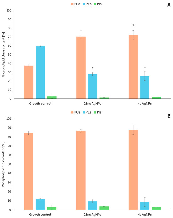 To further characterize the antifungal activity of mycogenic AgNPs, changes in the phospholipid profiles of C. albicans and A. flavus were evaluated. To accomplish this task, the following experimental variations were selected based on the AgNP antifungal activity determined in the previous experiments—28 ns AgNPs and 4 s AgNPs at a concentration of 0.19 μg/mL for C. albicans and 1.56 μg/mL for A. flavus. As a result, three phospholipid classes were detected in each of the tested fungal strains—phosphatidylcholines (PCs), phosphatidylethanolamines (PEs) and phosphatidylinositols (PIs). In C. albicans (Figure 2B), visible changes were noted in the content of PCs and PEs. The levels of PCs increased and those of PEs slightly decreased in the presence of both tested AgNP types compared to the growth control. The PI content was barely affected by the AgNPs. In the case of A. flavus (Figure 2A), changes in the content of the same phospholipid classes were observed. The presence of 28 ns and 4 s AgNPs caused about a two-fold increase in the content of PCs compared to the growth control. In parallel, a significant decrease in PEs was observed—the content of this phospholipid class was reduced by more than 50%. The content of PIs was only slightly influenced by the tested AgNPs.