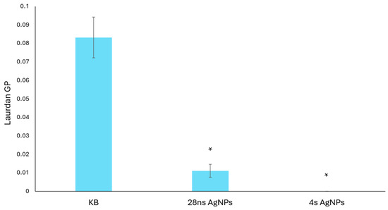 Changes in the cell membrane fluidity of C. albicans were determined in the presence of 28 ns and 4 s AgNPs at a concentration of 0.19 μg/mL using the Laurdan fluorescence spectroscopy method. The calculated generalized polarization (GP) parameter of Laurdan (Figure 3) confirmed that the presence of both tested AgNP types caused an increase in C. albicans cell membrane fluidity compared to the growth control. Moreover, it was observed that 4 s AgNPs at the tested concentration had a more severe effect.