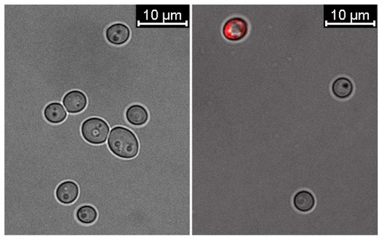 Figure 4. Changes in the cell membrane permeability of C. albicans in the presence of 0.19 μg/mL 28 ns AgNPs. The left image shows biotic control cells not treated with AgNPs. The right image shows cells treated with 28 ns AgNPs.